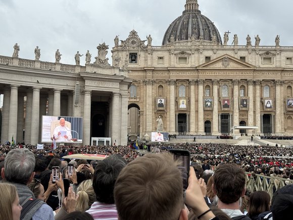 Ein wahrlich aufregender Tag liegt hinter uns oder mit anderen Worten: Dieser Tag war der Höhepunkt unserer Wallfahrt. Bereits um 6.45 Uhr ging es mit den Bussen von unseren Hotels aus los Richtung Petersplatz, denn heute stand die Generalaudienz mit Papst Leo XIV. auf dem Tagesprogramm. Neben den 357 Pilgerinnen und Pilgern aus Speyer wurden weitere 60.000 – 80.000 Gläubige erwartet. Eine unbeschreibliche Zahl, die in den vollen Straßen Roms spürbar war. Das Ziel war es natürlich: Papst Leo so nahe wie möglich zu kommen und eins oder auch zwei, oder vielleicht auch mehrere Fotos als Erinnerung mitnehmen zu können. Als wir auf dem Petersplatz ankamen, hieß es erstmal durchatmen: Die erste Hürde war geschafft. Und mit Blick auf die Uhr war auch gar nicht mehr viel Zeit, um einen guten Stehplatz zu ergattern. Kurz vor 10.00 Uhr erblickten wir ihn dann, wie er mit seinem Papamobil durch die abgesperrten Wege bis zum Petersdom fuhr. Ein wirklich besonderer Moment! Aufregung macht sich in der Gruppe breit, es wurde gejubelt und gerufen!